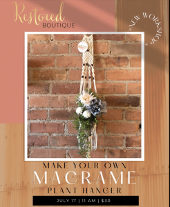 Sign up for Macramé Plant Hanger Workshop coming up on Saturday, July 17 at 11 AM!In this guided workshop, you will get to learn how to make your own plant hanger, and explore repeating patterns with different macramé knots in the same thread.The cost is only $30/person, and it covers all materials.Sign up today at https://restoredboutique.as.me/macramePhotos